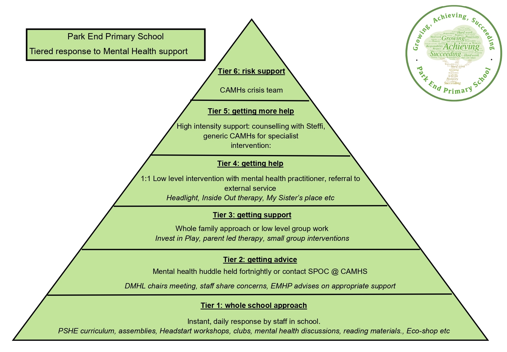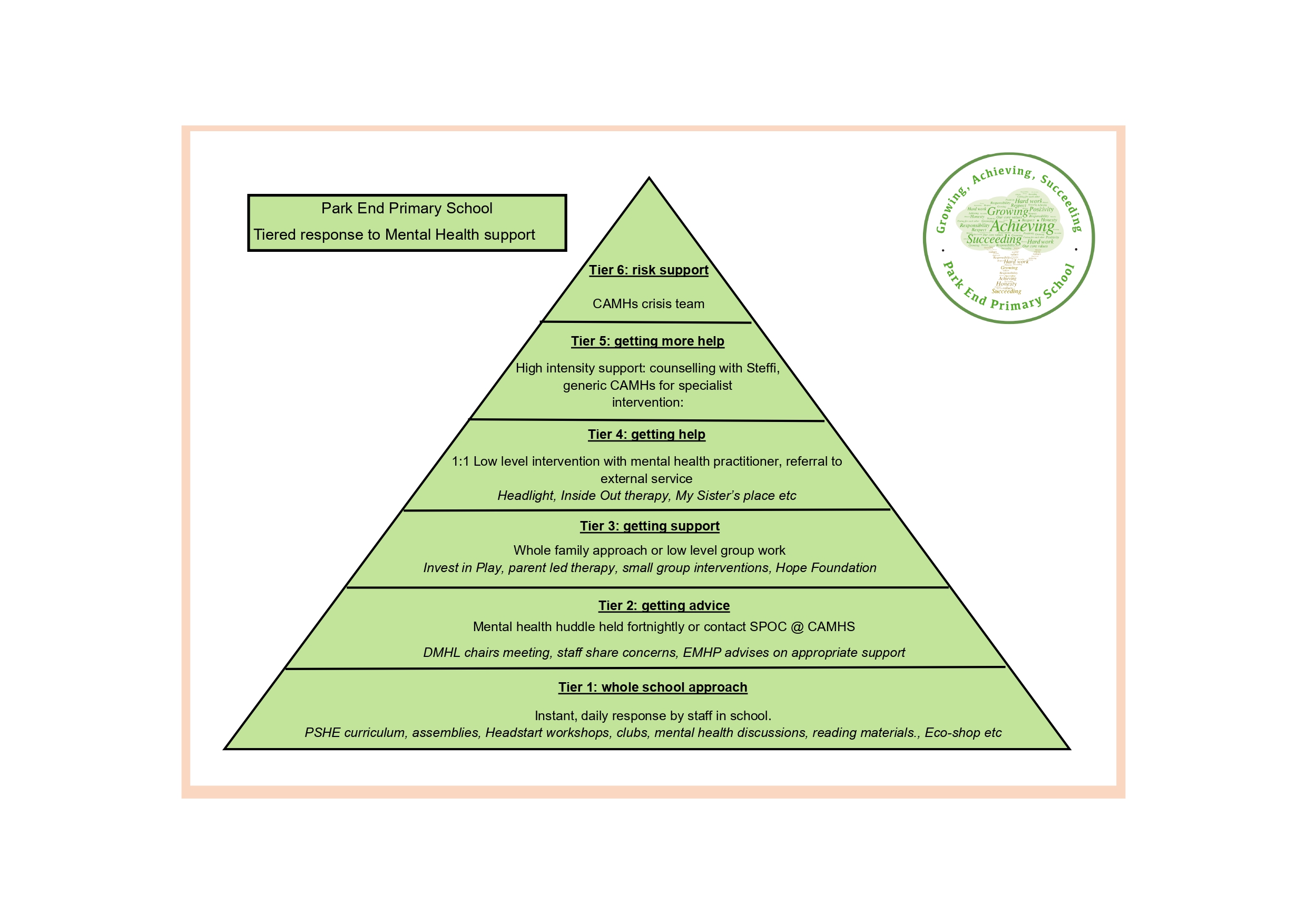 At Park End Primary, we place the emotional wellbeing and mental health of our children at the heart of everything that we do. That is why we have developed a robust tiered response of support for our children, and our curriculum ensures that pupils are taught how to prioritise their own emotional wellbeing and mental health.